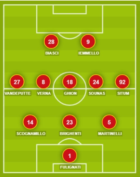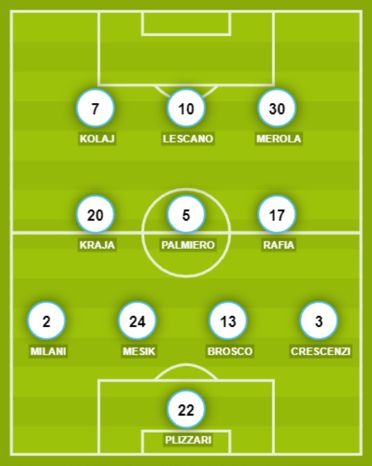 PESCARA (4-3-3): 22 Plizzari; 3 Crescenzi, 13 Brosco, 24 Mesik, 2 Milani; 17 Rafia, 5 Palmiero, 20 Kraja; 30 Merola, 10 Lescano, 7 Kolaj. A disposizione: 1 Sommariva, 31 D’Angelo, 18 Boben, 23 Pellacani, 28 Ingrosso, 8 Aloi, 19 Mora, 32 Gozzi, 88 Germinario, 9 Vergani, 11 Delle Monache, 21 Desogus, 27 Cuppone. Allenatore: Zeman.