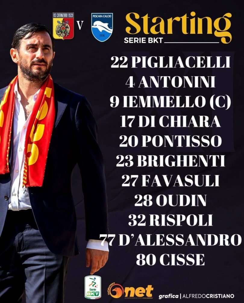 Questa la formazione di partenza del Catanzaro, schierata con l’ormai consueto 3-5-2: Pigliacelli; Brighenti, Antonini, Di Chiara; Favasuli, Oudin, Rispoli, Pontisso, D’Alessandro; Cisse, Iemmello.