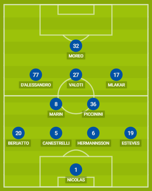 PISA (4-2-3-1): 1 Nicolas; 19 Esteves, 6 Hermannsson, 5 Canestrelli, 20 Beruatto; 36 Piccinini, 8 Marin; 17 Mlakar, 27 Valoti, 77 D’Alessandro; 32 Moreo. A disposizione: 22 Loria, 34 Campani, 3 Leverbe, 4 Caracciolo, 42 Barbieri, 16 Nagy, 44 Veloso, 51 Barberis, 7 Tramoni L., 9 Gliozzi, 23 Vignato, 26 Masucci, 28 Arena. Allenatore: Aquilani.