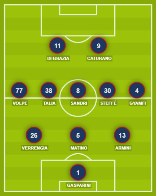 POTENZA (3-5-2): 1 Gasparini; 13 Armini, 5 Matino, 26 Verrengia; 4 Gyamfi, 30 Steffè, 8 Sandri, 38 Talia, 77 Volpe; 9 Caturano, 11 Di Grazia. A disposizione: 46 Alastra, 2 Rillo, 3 Celesia, 17 Polito, 6 Del Pinto, 20 Laaribi, 23 Logoluso, 10 Del Sole, 19 Belloni, 70 Schimmenti. Allenatore: Raffaele.