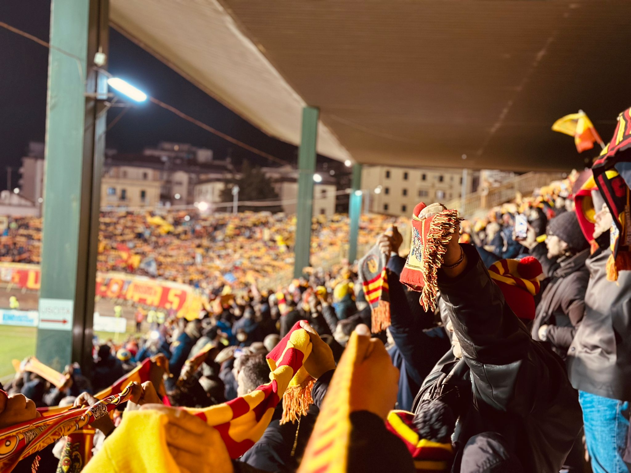 Non è il solito sabato a Catanzaro. Da Nord a Sud la città si veste a festa, cominciando a svelare tutto quello che, in questi mesi, era rimasto chiuso nel cassetto, forse per scaramanzia. Le bandiere colorano le strade e sventolano fiere. Subito dopo pranzo, le vie della città si popolano di tifosi vestiti di giallorosso. La destinazione finale è il “Nicola Ceravolo”. Le auto risalgono verso il quartiere Stadio. Tante le famiglie e i bambini al seguito: la continuazione di questa grande passione chiamata Catanzaro. Due ore prima della partita, all’apertura dei cancelli, il piazzale della biglietteria è già affollato. Gli spalti iniziano a gremirsi. Pian piano lo stadio si riempie e la curva, cuore pulsante del tifo giallorosso, è gremita come ai vecchi tempi, così come i Distinti. Ma il colpo d’occhio più bello è forse quello delle tribune senza barriere, il fascino del vecchio “Ceravolo”, un po’ retrò un po’ all’inglese. Bello vedere le scuole e tanti ragazzini vestiti di giallorosso incitare i propri beniamini. Alla fine fine sono 10mila gli spettatori, con 216 tifosi dell’Avellino, giunti a Catanzaro nonostante il campionato poco entusiasmante dei lupi. Una passione, quella degli irpini, che affonda le sue radici proprio in quegli anni ’70-’80 in cui Catanzaro e Avellino era protagoniste nella serie A a 16 squadre.