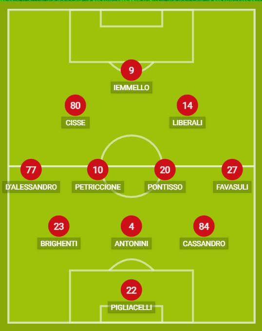 CATANZARO (3-4-2-1): 22 Pigliacelli; 84 Cassandro, 4 Antonini, 23 Brighenti; 27 Favasulii, 20 Pontisso, 10 Petriccione, 77 D’Alessandro; 14 Liberali, 80 Cisse; 9 Iemmello. A disposizione: 1 Marietta, 3 Esteves, 6 Fellipe Jack, 26 Verrengia, 62 Frosinini, 21 Pompetti, 30 Alesi, 32 Rispoli, 98 Buglio, 19 Nuamah, 39 Koffi, 94 Di Francesco. Allenatore: Aquilani.