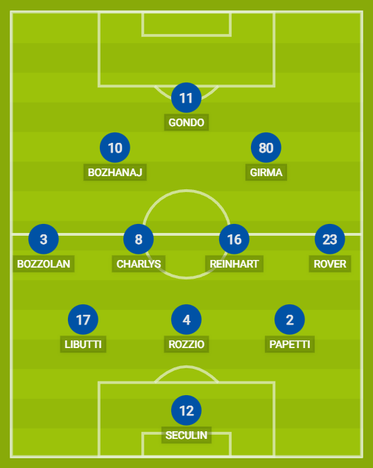 REGGIANA (3-4-2-1): 12 Seculin; 2 Papetti, 4 Rozzio, 17 Libutti; 23 Rover, 16 Reinhart, 8 Charlys, 3 Bozzolan; 80 Girma, 10 Bozhanaj; 11 Gondo. A disposizione: 1 Micai, 6 Vallarelli, 7 Paz, 14 Quaranta, 33 Tripaldelli, 34 Vicari, 43 Bonetti, 44 Mendicino, 57 Belardinelli, 9 Novakovic, 77 Fumagalli, 93 Lambourde. Allenatore: Dionigi.
