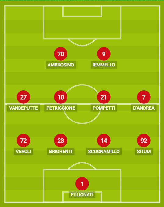 CATANZARO (4-4-2): 1 Fulignati; 92 Situm, 14 Scognamillo, 23 Brighenti, 72 Veroli; 7 D’Andrea, 21 Pompetti, 10 Petriccione, 27 Vandeputte; 9 Iemmello, 70 Ambrosino. A disposizione: 16 Sala, 4 Antonini, 32 Krajnc, 44 Miranda, 8 Verna, 20 Pontisso, 24 Sounas, 33 Oliveri, 17 Brignola, 19 Stoppa, 28 Biasci, 99 Donnarumma. Allenatore: Vivarini.
