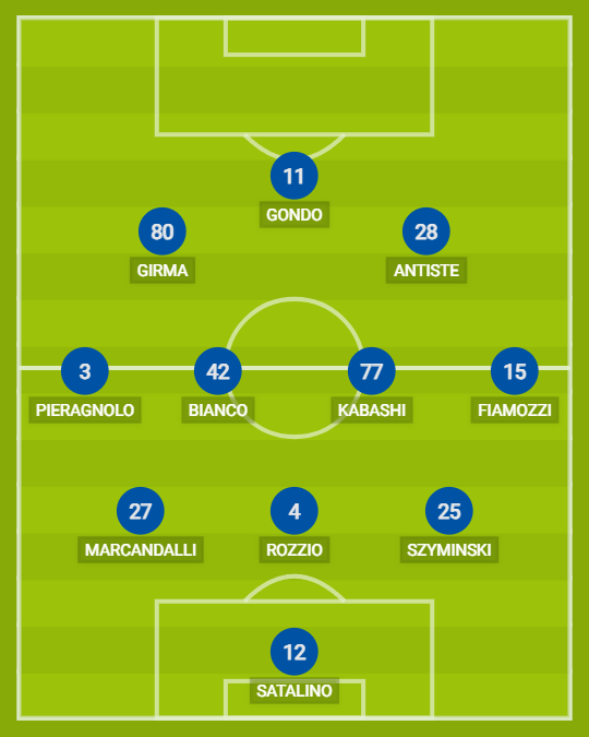 REGGIANA (3-4-2-1): 12 Satalino; 25 Szyminski, 4 Rozzio, 27 Marcandalli; 15 Fiamozzi, 77 Kabashi, 42 Bianco, 3 Pieragnolo; 28 Antiste, 80 Girma; 11 Gondo. A disposzione: 1 Sposito, 13 Motta, 17 Libutti, 29 Pajac, 16 Reinhart, 8 Cigarini, 72 Melegoni, 78 Blanco, 90 Portanova, 7 Varela Djamanca, 18 Okwonkwo, 23 Pettinari. Allenatore: Nesta.