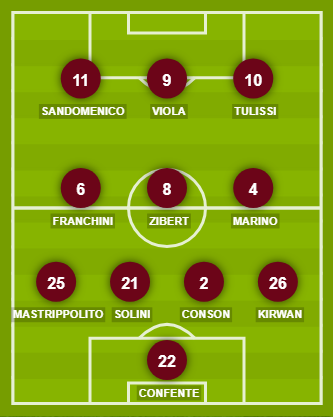 CATANZARO (3-4-3): 1 Furlan; 5 Celiento, 14 Riggio, 23 Figliomeni; 11 Statella, 4 Maita, 8 Iuliano, 13 Favalli; 17 Kanoute, 2 Ciccone, 7 D’Ursi. A disposizione: 12 Elezaj, 22 Mittica, 6 Nicoletti, 18 Nikolopoulos, 16 Eklu, 19 De Risio, 25 Posocco, 10 Giannone, 27 Repossi, 21 Fischnaller, 9 Infantino. Allenatore: Auteri.