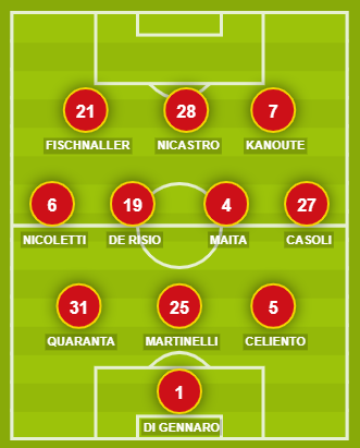 CATANZARO (3-4-3): 1 Di Gennaro; 5 Celiento, 25 Martinelli, 31 Quaranta; 27 Casoli, 4 Maita, 19 De Risio, 6 Nicoletti; 7 Kanoute, 28 Nicastro, 21 Fischnaller. A disposizione: 22 Adamonis, 12 Mittica, 14 Riggio, 15 Signorini, 16 Elizalde, 30 Pinna, 26 Risolo, 9 Calì, 10 Giannone, 18 Bianchimano, 20 Di Livio, 29 Mangni. Allenatore: Auteri.