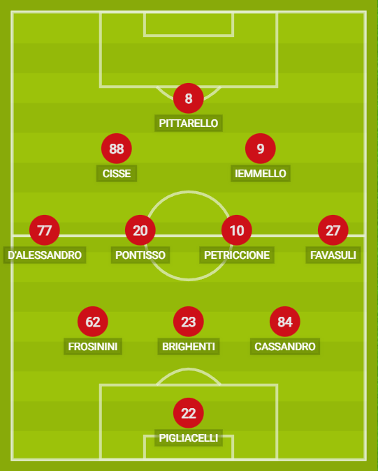 CATANZARO (3-4-2-1): 22 Pigliacelli; 84 Cassandro, 23 Brighenti, 62 Frosinini; 27 Favasulii, 10 Petriccione, 20 Pontisso, 77 D’Alessandro; 9 Iemmello, 80 Cisse; 8 Pittarello. A disposizione: 1 Marietta, 99 Borrelli, 5 Bashi, 17 Di Chiara, 14 Liberali, 21 Pompetti, 30 Alesi, 32 Rispoli, 98 Buglio, 7 Pandolfi, 19 Nuamah, 94 Di Francesco. Allenatore: Aquilani.