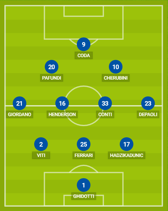 SAMPDORIA (3-4-2-1): 1 Ghidotti; 17 Hadzikadunic, 25 Ferrari, 2 Viti; 23 Depaoli, 33 Conti, 16 Henderson, 21 Giordano; 20 Pafundi, 10 Cherubini; 99 Coda. A disposizione: 30 Ravaglia, 50 Martinelli, 5 Riccio, 13 Palma, 28 Abildgaard, 31 Vulikic, 8 Ricci, 11 Begic, 14 Bellemo, 19 Girelli, 34 Casalino, 99 Brunori. Allenatori: Foti-Gregucci.