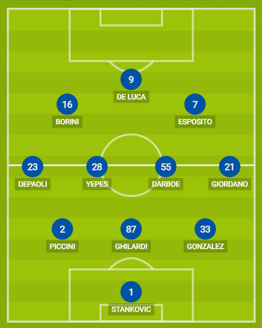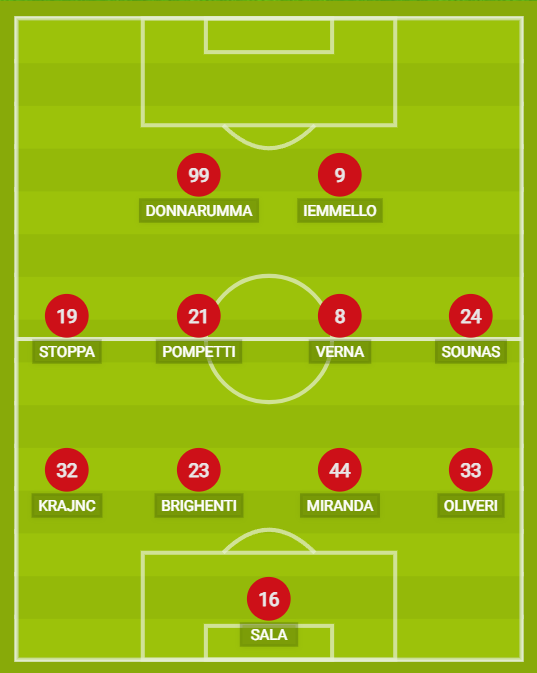 SAMPDORIA (3-4-2-1): 1 Stankovic; 2 Piccini, 87 Ghilardi, 33 Gonzalez; 23 Depaoli, 28 Yepes, 55 Darboe, 21 Giordano; 7 Esposito, 16 Borini; 9 De Luca. A disposizione: 22 Ravaglia, 12 Tantalocchi, 3 Barreca, 13 Conti, 25 Ferrari, 40 Stojanovic, 46 Leoni, 5 Askildsen, 8 Ricci, 10 Verre, 14 Kasami, 80 Benedetti, 19 Alvarez. Allenatore: Pirlo.