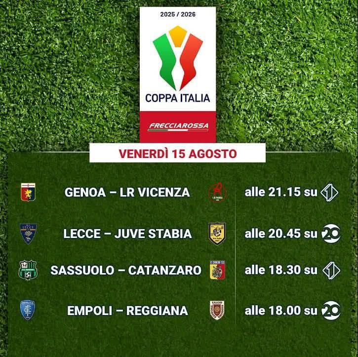 Dopo la disputa dei preliminari – che hanno visto la qualificazione di Virtus Entella (4-0 alla Ternana), Vicenza (corsaro per 2-0 a Padova), Cerignola (1-0 sull’Avellino, con gara giocata in Puglia) e Pescara (che ha superato 1-0 il Rimini) – nel giorno di ferragosto inizieranno i 32-esimi di finale di Coppa Italia, con le quattro gare che vedete in copertina (con la relativa rete di trasmissione televisiva). La partita delle Aquile sarà visibile in chiaro su Italia 1, con inizio alle 18:30.
