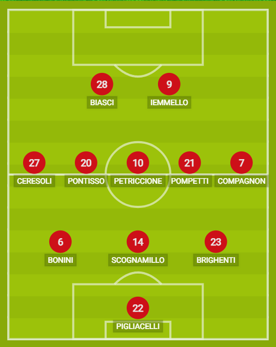 SPEZIA (3-5-2): 66 Gori; 2 Wisniewski, 55 Hristov, 77 Bertola; 37 Mateju, 8 Nagy, 5 Esposito S., 25 Bandinelli, 7 Elia; 9 Esposito P., 17 Colak. A disposizione: 1 Sarr, 12 Mascardi, 4 Ferrer, 13 Reca, 31 Aurelio, 44 Benvenuto, 65 Giorgeschi, 6 Degli Innocenti, 36 Candelari, 11 Falcinelli, 20 Di Serio, 27 Soleri. Allenatore: D’Angelo.