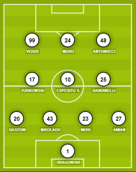 SPEZIA (4-3-3): 1 Dragowski 27 Amian, 23 Muhl, 43 Nikolaou, 20 Bastoni; 25 Bandinelli, 10 Esposito S., 17 Zurkowski; 48 Antonucci, 24 Moro, 99 Verde. A disposizione: 1 Zoet, 40 Zovko, 4 Moutinho, 33 Gelashvili, 55 Hristov, 77 Bertola, 8 Ekdal, 15 Pietra, 21 Corradini, 29 Cassata, 80 Kouda, 9 Esposito P., 11 Cipot, 19 Krollis. Allenatore: Alvini.
