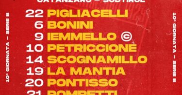 CATANZARO (3-5-2): Pigliacelli; Brighenti, Scognamillo, Bonini; D’Alessandro, Pontisso, Petriccione, Pompetti, Situm; Iemmello, La Mantia. Allenatore: Salvatore Accursi. A disposizione: Dini, Antonini, Koutsoupias, Brignola, Pagano, Ceresoli, Biasci, Seck, Buso, Coulibaly, Cassandro, Pittarello.