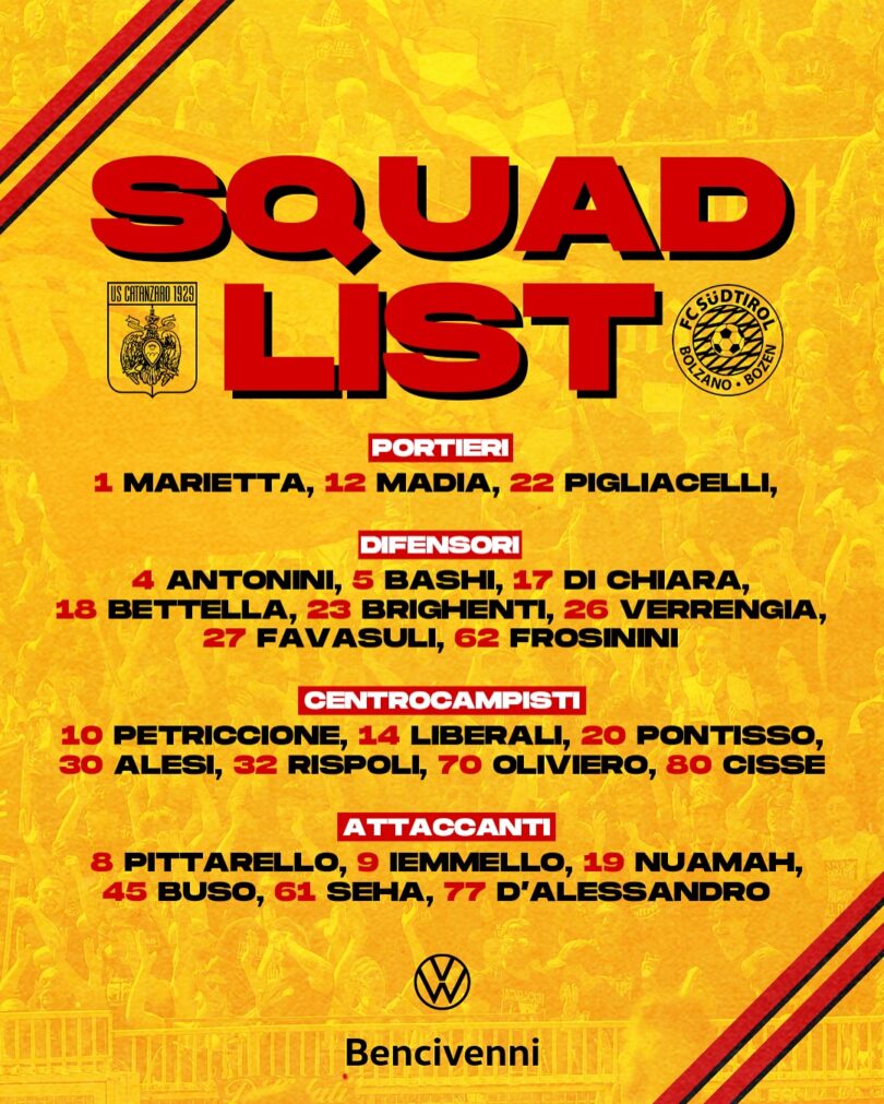 Disponibile Mirko Pigliacelli, che in settimana è stato sottoposto a terapie per il problema muscolare rimediato a ferragosto in Coppa Italia a Reggio Emilia col Sassuolo. Manca invece il terzo portiere Borrelli e al suo posto è convocato il giovanissimo Madia. Tra i 24 in elenco non figura Giovanni Volpe e tra i giovani ex primavera aggregati alla prima squadra c’è il solo Oliviero.
