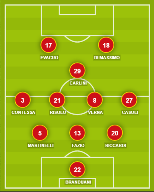 CATANZARO (3-4-1-2): 22 Branduani; 20 Riccardi, 13 Fazio, 5 Martinelli; 27 Casoli, 8 Verna, 21 Risolo, 3 Contessa; 29 Carlini; 18 Di Massimo, 17 Evacuo. A disposizione: 33 Di Gennaro, 12 Iannì, 6 Salines, 14 Riggio, 19 Pinna, 32 Garufo, 4 Corapi, 15’ Evan’s, 23 Baldassin, 25 Altobelli, 7 Curiale, 9 Di Piazza. Allenatore: Calabro.
