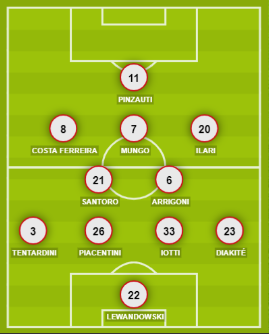 TERAMO (4-2-3-1): 22 Lewandowski; 23 Diakité, 33 Iotti, 26 Piacentini, 3 Tentardini; 6 Arrigoni, 21 Santoro; 20 Ilari, 7 Mungo, 8 Costa Ferreira; 11 Pinzauti. A disposizione: 1 Valentini, 4 Trasciani, 5 Soprano, 24 Celentano, 27 Di Matteo, 9 Cappa, 14 Minelli, 17 Di Francesco, 25 Birligea, 32 Bunino. Allenatore: Paci.