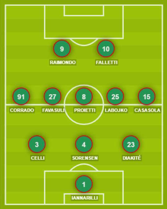 TERNANA (3-5-2): 1 Iannarilli; 23 Diakité, 4 Sorensen, 3 Celli; 15 Casasola, 25 Labojko, 8 Proietti, 27 Favasuli, 91 Corrado; 10 Falletti, 9 Raimondo. A disposizione: 17 Brazao, 12 Vitali, 13 Mantovani, 19 Capuano, 26 Bogdan, 33 Travaglini, 44 Lucchesi, 20 Paghera, 66 Pyyhtia, 71 Luperini, 73 Marginean, 11 Capanni, 17 Favilli, 28 Distefano. Allenatore: Lucarelli.