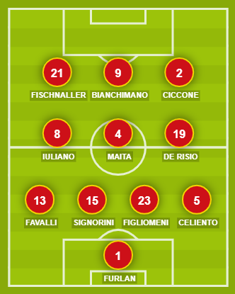 CATANZARO (4-3-3): 1 Furlan; 5 Celiento, 23 Figliomeni, 15 Signorini, 13 Favalli; 19 De Risio, 4 Maita, 8 Iuliano; 2 Ciccone, 9 Bianchimano, 21 Fischnaller. A disposizione: 12 Elezaj, 22 Mittica, 3 Pambianchi, 14 Riggio, 6 Nicoletti, 20 Lame, 18 Nikolopoulos, 25 Posocco, 7 D’Ursi, 10 Giannone, 33 Cristiano. Allenatore: Auteri.