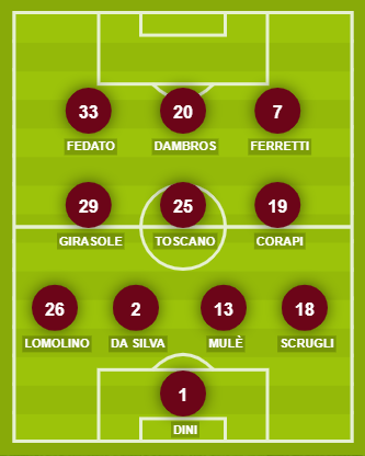 TRAPANI (4-3-3): 1 Dini; 18 Scrugli, 13 Mulè, 2 Da Silva, 26 Lomolino; 19 Corapi, 25 Toscano, 29 Girasole; 7 Ferretti, 20 Dambros, 33 Fedato. A disposizione: 22 Cavalli, 27 Ferrara, 3 Ramos, 6 Scognamillo, 21 Garufo, 34 Franco, 10 Costa Ferreira, 14 Tolomello, 16 D’Angelo, 9 Evacuo, 24 Golfo. Allenatore: Italiano.