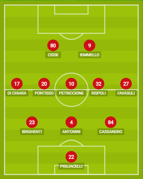 CATANZARO (3-5-2): 22 Pigliacelli; 84 Cassandro, 4 Antonini, 23 Brighenti; 27 Favasuli, 32 Rispoli, 10 Petriccione, 20 Pontisso, 17 Di Chiara; 9 Iemmello, 80 Cisse. A disposizione: 1 Marietta, 5 Bashi, 18 Bettella, 14 Liberali, 28 Oudin, 30 Alesi, 98 Buglio, 7 Pandolfi, 8 Pittarello, 19 Nuamah, 45 Buso, 77 D’Alessandro. Allenatore: Aquilani.