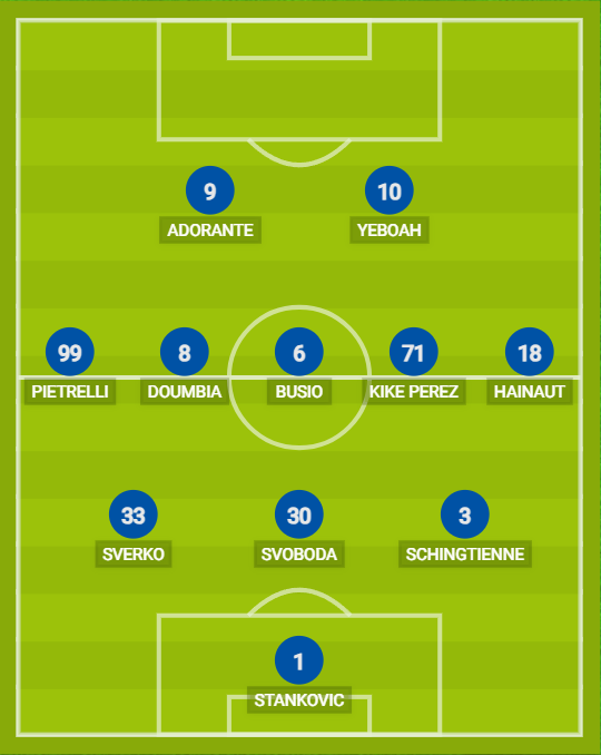 VENEZIA (3-5-2): 1 Stankovic; 3 Schingtienne, 30 Svoboda, 33 Sverko; 18 Hainaut, 71 Kike Perez, 6 Busio, 8 Doumbia, 99 Pietrelli; 10 Yeboah, 9 Adorante. A disposizione: 23 Grandi, 2 Korac, 4 Franjic, 5 Haps, 16 Venturi, 20 Sagrado, 19 Bjarkason, 24 Lella, 32 Duncan, 37 Bohinen, 7 Fila, 80 Casas. Allenatore: Stroppa.