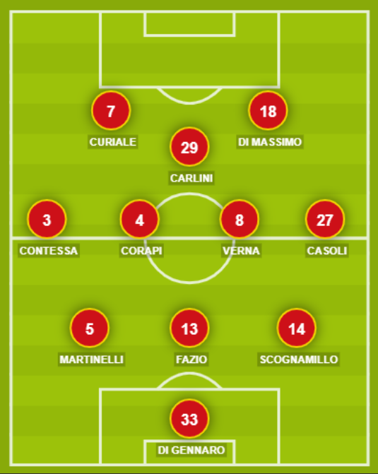CATANZARO (3-4-1-2): 33 Di Gennaro; 14 Scognamillo, 13 Fazio, 5 Martinelli; 27 Casoli, 8 Verna, 4 Corapi, 3 Contessa; 29 Carlini; 18 Di Massimo, 7 Curiale. A disposizione: 1 Mittica, 6 Salines, 19 Gatti, 20 Riccardi, 32 Garufo, 10 Parlati, 21 Risolo, 23 Baldassin, 34 Porcino, 15 Molinaro, 17 Evacuo, 25 Grillo. Allenatore: Calabro.