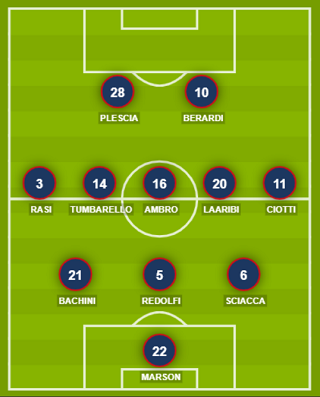 VIBONESE (3-5-2): 22 Marson; 6 Sciacca, 5 Redolfi, 21 Bachini; 11 Ciotti, 20 Laaribi, 16 Ambro, 14 Tumbarello, 3 Rasi; 10 Berardi, 28 Plescia. A disposizione: 1 Mengoni, 13 Falla, 24 Riga, 32 Fomov, 33 Murati, 9 La Ragione, 15 Leone, 17 Di Santo, 18 Statella, 19 Parigi, 26 Mancino. Allenatore: Galfano.