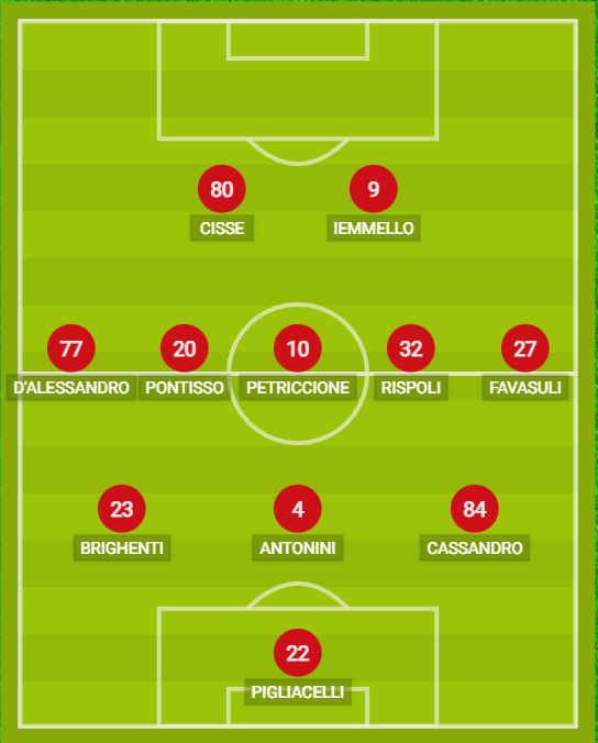 CATANZARO (3-5-2): 22 Pigliacelli; 84 Cassandro, 4 Antonini, 23 Brighenti; 27 Favasuli, 32 Rispoli, 10 Petriccione, 20 Pontisso, 77 D’Alessandro; 9 Iemmello, 80 Cisse. A disposizione: 1 Marietta, 17 Di Chiara, 18 Bettella, 62 Frosinini, 14 Liberali, 28 Oudin, 30 Alesi, 98 Buglio, 7 Pandolfi, 8 Pittarello, 45 Buso, 94 Di Francesco. Allenatore: Aquilani.
