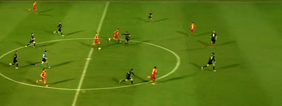 Così per esempio, invece di assistere al lancio lungo di Martinelli, in fase di costruzione Atanasov e Celiento si abbassavano di qualche metro invitando gli ospiti al pressing, che tuttavia risultava poco efficace in quanto Tounkara e Bunino restavano larghi e Bensaja finiva per staccarsi dalla linea mediana trovandosi a metà strada fra Corapi e DeRisio, che con il fraseggio corto e rapido salivano velocemente tagliando in due la formazione ospite.