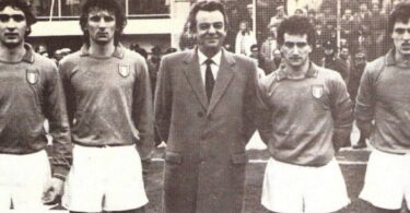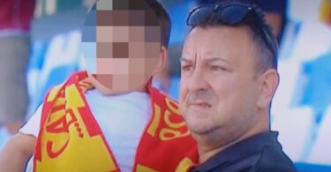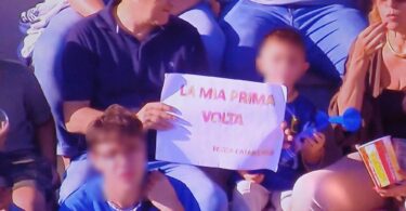 Uno scatto: un padre emigrato stringe il figlio avvolto nel giallorosso