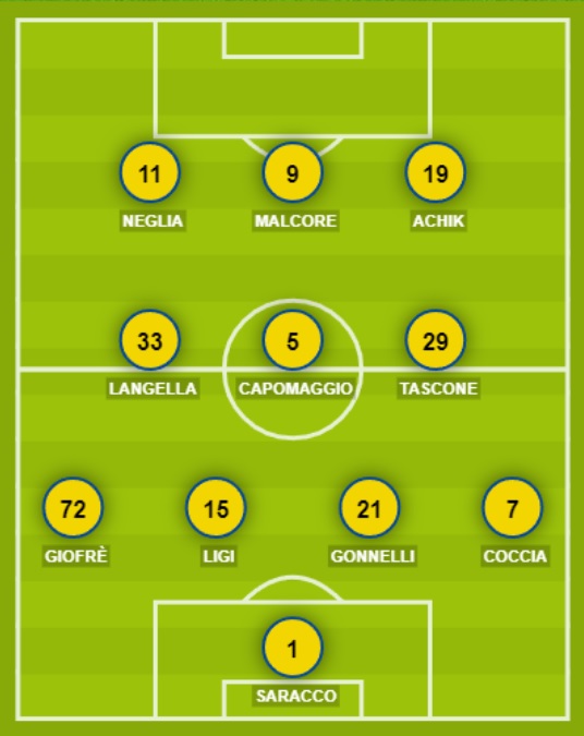 CATANZARO (3-5-2): 1 Fulignati; 5 Martinelli, 23 Brighenti, 14 Scognamillo; 92 Situm, 24 Sounas, 18 Ghion, 8 Verna, 27 Vandeputte; 28 Biasci, 9 Iemmello. A disposizione: 16 Sala, 44 Gatti, 45 Mulè, 3 Tentardini, 6 Welbeck, 20 Pontisso, 88 Cinelli, 10 Bombagi, 21 Curcio, 99 Cianci. Allenatore: Vivarini.
