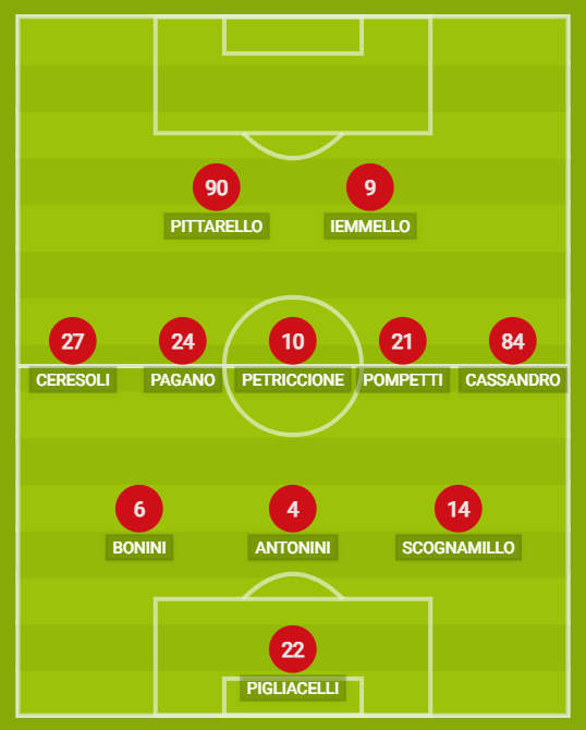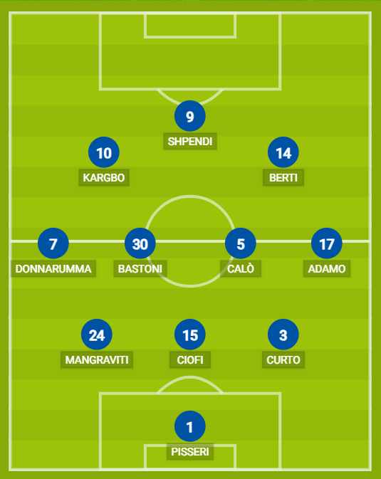 CESENA (3-4-2-1): 1 Pisseri; 3 Curto, 15 Ciofi, 24 Mangraviti; 17 Adamo, 5 Calò, 30 Bastoni, 7 Donnarumma; 14 Berti, 10 Kargbo; 9 Shpendi. A disposizione: 33 Klinsmann, 93 Siano, 26 Piacentini, 71 Manetti, 73 Pieraccini, 8 Castorri, 11 Ceesay, 13 Celia, 70 Francesconi, 23 Antonucci, 92 Coveri. Allenatore: Mignani.