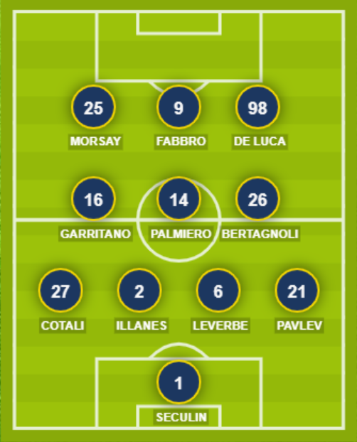 CHIEVO VERONA (4-3-3): 1 Seculin; 21 Pavlev, 6 Leverbe, 2 Illanes, 27 Cotali; 26 Bertagnoli, 14 Palmiero, 16 Garritano; 98 De Luca, 9 Fabbro, 25 Morsay. A disposizione: 22 Confente, 5 Rigione, 13 Renzetti, 32 Mogos, 72 Rondinella, 95 Munaretti, 7 Ivan, 8 Zuelli, 10 Obi, 43 Tuzzo, 45 Metlika, 11 Pucciarelli, 20 Grubac. Allenatore: Aglietti.