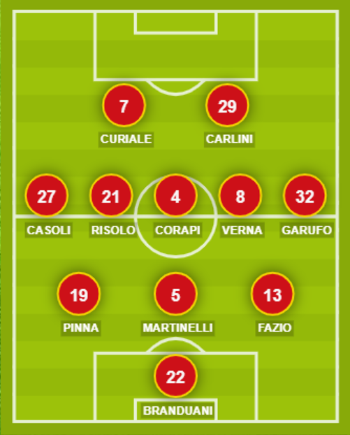 CATANZARO (3-5-2): 22 Branduani; 13 Fazio, 5 Martinelli, 19 Pinna; 32 Garufo, 8 Verna, 4 Corapi, 21 Risolo, 27 Casoli; 29 Carlini, 7 Curiale. A disposizione: 1 Mittica, 12 Iannì, 14 Riggio, 26 Pipicella, 2 Bayeye, 16 Mirarchi, 28 Iseppon, 24 Cristiano. Allenatore: Calabro.