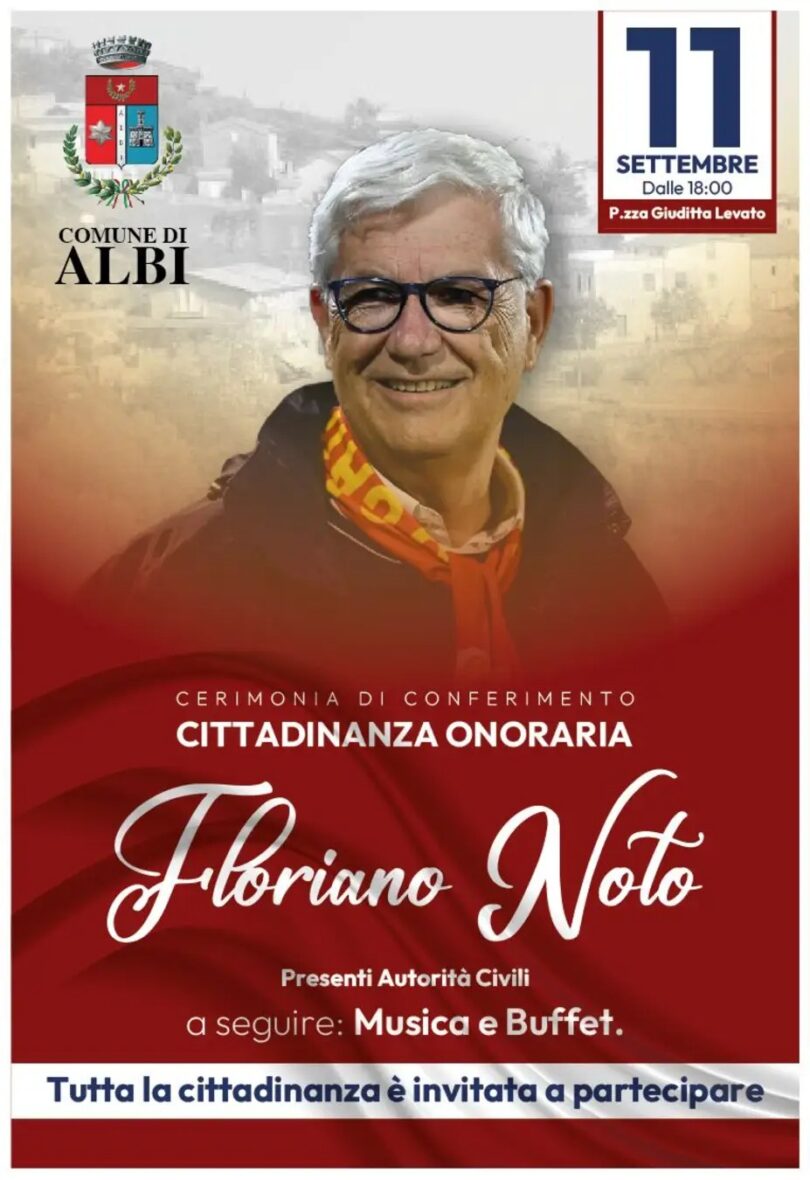 Domani 11 settembre 2025, alle ore 18:00 in Piazza Giuditta Levato ad Albi, si terrà la cerimonia di conferimento della cittadinanza onoraria all’Ing. Floriano Noto, imprenditore di spicco e presidente dell’U.S. Catanzaro 1929, originario del borgo.