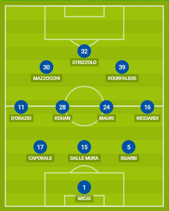 COSENZA (3-4-2-1): 1 Micai; 29 Sgarbi, 15 Dalle Mura, 17 Caporale; 16 Ricciardi, 24 Mauri, 28 Kouan, 11 D’Orazio; 39 Kourfalidis, 30 Mazzocchi; 32 Strizzolo. A disposizione: 22 Vettorel, 2 Cimino, 4 Martino, 9 Sankoh, 23 Venturi, 55 Hristov, 6 Charlys, 20 Rizzo Pinna, 31 Ricci, 10 Fumagalli, 19 Ciervo, 21 Zilli. Allenatore: Alvini