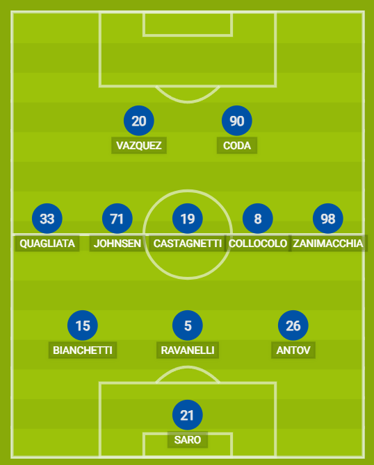 CREMONESE (3-5-2): 21 Saro; 26 Antov, 5 Ravanelli, 15 Bianchetti; 98 Zanimacchia, 8 Collocolo, 19 Castagnetti, 71 Johnsen, 33 Quagliata; 90 Coda, 20 Vazquez. A disposizione: 22 Jungdal, 4 Marrone, 13 Tuia, 17 Sernicola, 18 Ghiglione, 44 Lochoshvili, 6 Pickel, 7 Falletti, 32 Abrego, 37 Majer, 9 Ciofani, 10 Buonaiuto, 74 Tsadjout. Allenatore: Stroppa.