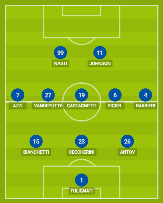 CREMONESE (3-5-2): 1 Fulignati; 26 Antov, 23 Ceccherini, 15 Bianchetti; 4 Barbieri, 6 Pickel, 19 Castagnetti, 27 Vandeputte, 7 Azzi; 11 Johnson, 99 Nasti. A disposizione: 12 Drago, 30 Tannander, 5 Ravanelli, 42 Moretti, 55 Folino, 14 Gelli, 18 Collocolo, 37 Majer, 98 Zanimacchia, 9 De Luca, 90 Bonazzoli. Allenatore: Stroppa.