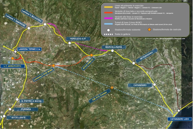 La tematica della velocizzazione della linea Lamezia Terme – Catanzaro Lido non è certo nuova, nè nel nostro blog nè sulla bocca di una buona parte di calabresi. E’ chiaro che tale linea rappresenti il canale naturale di collegamento tra il capoluogo e, praticamente, il resto d’Italia, con il maggior aeroporto della regione e la importantissima stazione di Lamezia Terme Centrale. Tuttavia la linea, allo stato attuale, si presenta in uno stato non propriamente degno di un potenziale corridoio di grande comunicazione: a parte gli arcinoti guai derivanti dall’uso del cemento depotenziato nella variante Catanzaro Lido – Settingiano, il rimanente tratto fino a Lamezia Terme Centrale soffre di una spiccata tortuosità (e quindi una velocità massima ammessa che non supera i 95 km/h), specie nel tratto compreso tra Marcellinara e Nicastro, oltretutto posto in un terreno dalla non propriamente affidabile idrogeologia. Oltre a ciò, Lamezia Terme rappresenta un caso non poco interessante da esaminare: il collegamento ferroviario tra la stazione centrale e l’aeroporto è un’opera che, se da un lato si rivela dalla incredibile facilità, dall’altro potrebbe permettere un incredibile balzo in avanti sia per la trasversale Jonio – Tirreno che per la Tirrenica intera, permettendo veloci collegamenti dal terminal aeroportuale con tutta la Regione e non solo. Un esempio direttamente paragonabile è l’aeroporto di Pisa, connesso a Pisa Centrale con una bretella di 2 km circa e percorso da un treno ogni mezz’ora circa, più qualche corsa diretta su Firenze.