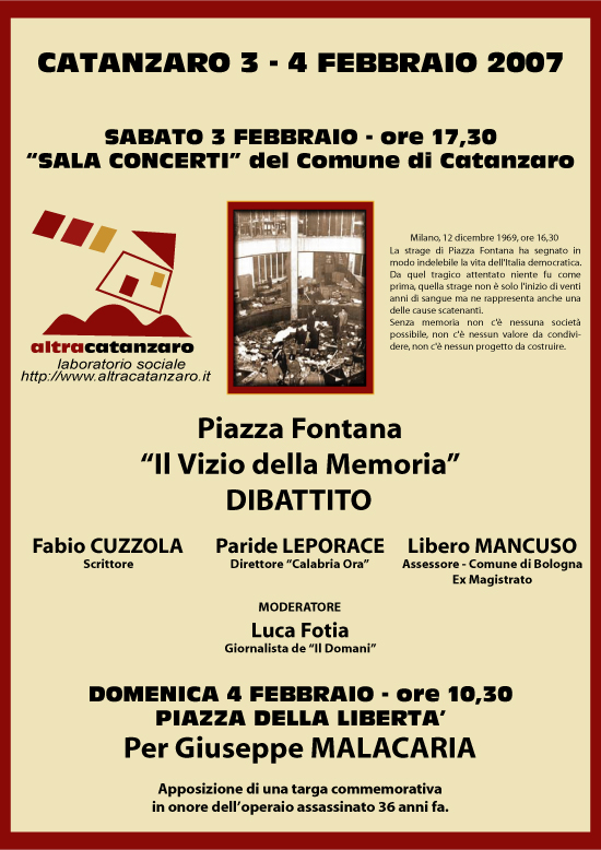 In occasione del suo primo anno di attività, il laboratorio sociale Altra Catanzaro organizza un Dibattito dal titolo “Piazza Fontana – Il Vizio della Memoria” che si terrà presso la Sala Concerti del Comune di Catanzaro Sabato 3 Febbraio con inizio alle ore 17,30.