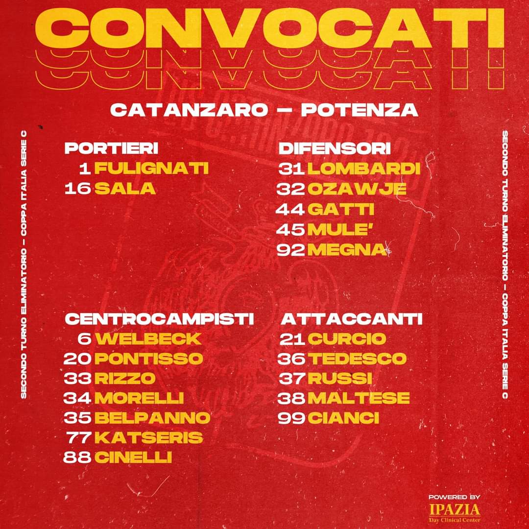 Ovviamente Vivarini darà spazio a chi ha giocato di meno e lascerà a riposo molti titolari in vista del derby di domenica prossima con il Crotone. Sono solo 19 i convocati, compresi tanti ragazzi della Primavera 3. Fazio sarà assente per squalifica. Nella formazione di domani, ci sarà Sala fra i pali, con Gatti, Mulè e il giovane Megna a comporre il trio difensivo. Welbeck, Cinelli, Pontisso e Katseris dovrebbero agire sulla mediana con Curcio e Cianci in attacco. Uno dei giovani della Primavera 3 completerà l’undici iniziale che scenderà in campo. Alle ore 19 erano circa 400 i biglietti venduti, oltre a 19 ospiti. Mister Raffaele, tornato a Potenza dopo l’esonero di Siviglia, ha convocato per la partita di domani 22 calciatori, tra i quali figura il giovane attaccante Schimmenti cresciuto nelle giovanili del Catanzaro.