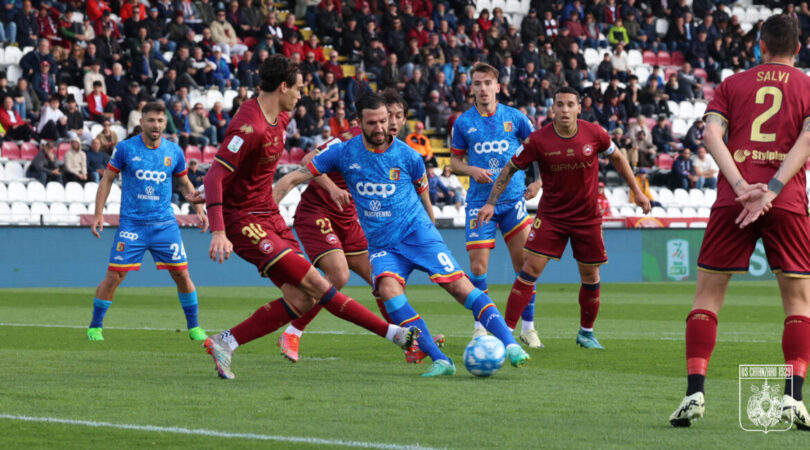 La conseguente uscita del Catanzaro vede però Sounas che tergiversa e regala un fallo laterale che spiove nel cuore dell’area di rigore. Nel duello aereo fra Scognamillo e Pittarello è il difensore a toccare la palla che gli scivola sul braccio. E’ un rigore assurdo frutto di un regolamento assurdo e Dionisi non può che assegnare il rigore che Baldini al 29° trasforma. Fino al termine del primo tempo non accadrà nulla ma il Catanzaro è ben presente in campo. Miranda a inizio ripresa rileva l’ammonito Scognamillo che soffre la fisicità di Pittarello e per questo viene sostituito per evitargli un secondo giallo già rischiato nei primi 45 minuti.