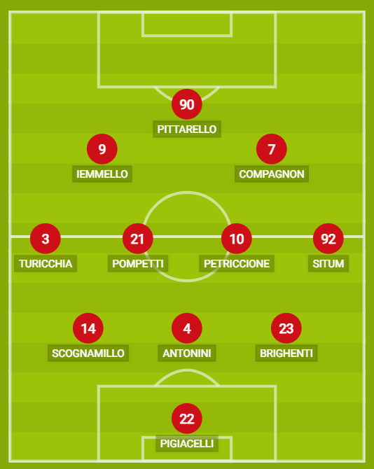 CATANZARO (3-4-2-1): 22 Pigliacelli; 23 Brighenti, 4 Antonini, 14 Scognamillo; 92 Situm, 10 Petriccione, 21 Pompetti, 3 Turicchia; 7 Compagnon, 9 Iemmello; 90 Pittarello. A disposizione: 1 Dini, 99 Borrelli, 2 Piras 27 Ceresoli, 32 Krajnc, 62 Megna, 64 Rizzo, 20 Pontisso, 24 Pagano, 61 Maiolo, 77 Volpe, 28 Biasci, 63 Refele. Allenatore: Caserta.