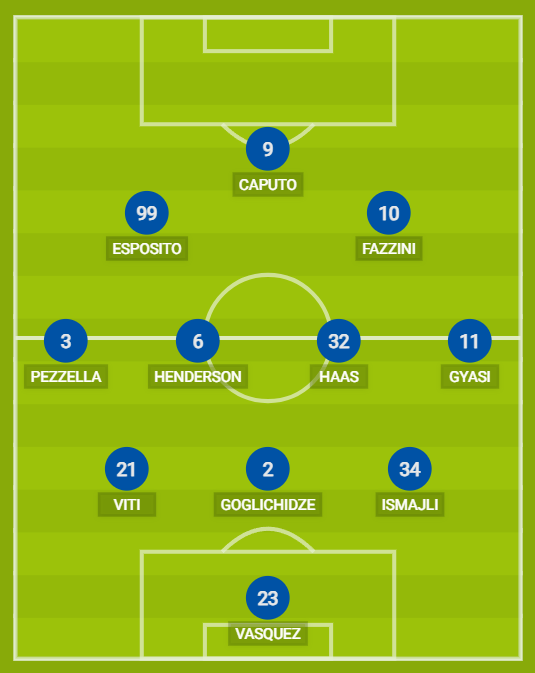 EMPOLI (3-4-2-1): 23 Vasquez; 34 Ismajli, 2 Goglichidze, 21 Viti; 11 Gyasi, 32 Haas, 6 Henderson, 3 Pezzella; 10 Fazzini, 99 Esposito; 9 Caputo. A disposizione: 12 Seghetti, 98 Brancolini, 4 Walukiewicz, 5 Grassi, 13 Cacace, 14 Guarino, 20 Donati, 30 Stojanovic, 38 Sodero, 7 Shpendi, 19 Ekong, 29 Colombo. Allenatore: D’Aversa.