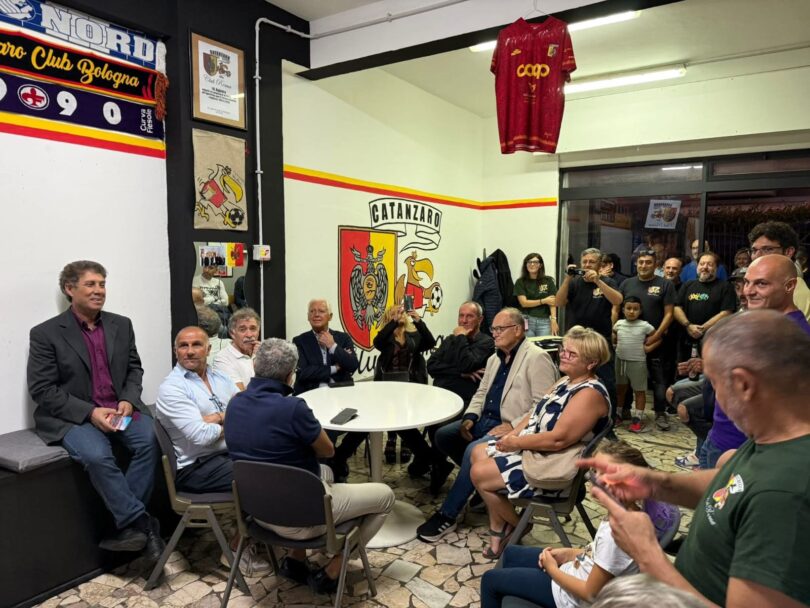 È stata una grande festa quella che si è svolta venerdì 26 nella Capitale, in via Diano Marina 54, indirizzo della sede ufficiale del Catanzaro Club Roma. Ad un anno dalla nascita, questo luogo ritenuto ormai casa da molti tifosi giallorossi è stato celebrato nel miglior modo possibile da tantissimi appassionati di calcio, che hanno colto l’ occasione per riunirsi e vivere qualche momento di gioia e goliardia in compagnia. La serata è stata allietata dalla presenza delle Vecchie Glorie del grande Catanzaro della serie A: Palanca, Banelli, Borrello, Vichi, Proietti, Ussia sono stati gli ospiti d’onore dell’evento concedendosi ai tifosi con chiacchiere, fotografie e autografi, per poi essere omaggiati dal Direttivo del Catanzaro Club Roma con maglia, portachiavi ufficiale e tessera ad honorem del Club, il tutto documentato dalla diretta prepartita di uscatanzaro.net; i medesimi riconoscimenti sono andati a Massimo Ivan Falsetta (regista cinematografico catanzarese) e Franco Serratore di “Profumi e sapori della Calabria”, associazione partner del Catanzaro Club Roma che ha fornito l’ottimo buffet calabrese offerto dal Club a tutti i presenti.