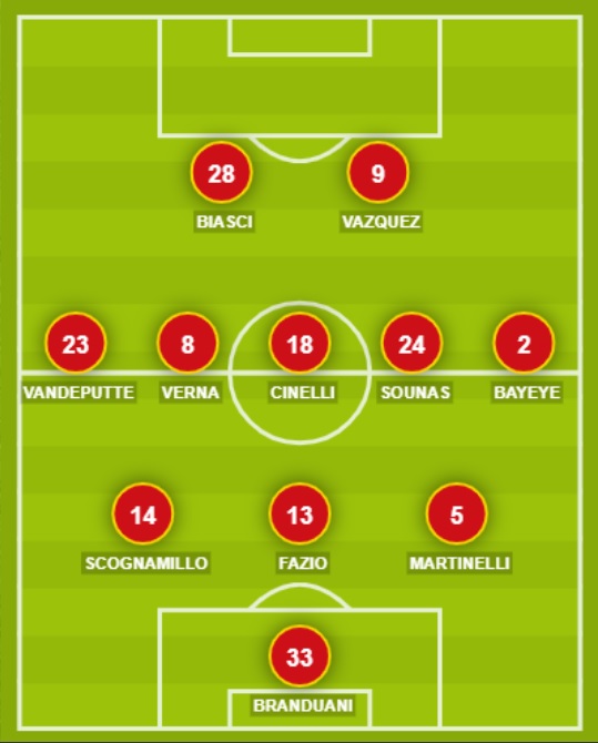 CATANZARO (3-5-2): 33 Branduani; 5 Martinelli, 13 Fazio, 14 Scognamillo; 2 Bayeye, 24 Sounas, 18 Cinelli, 8 Verna, 23 Vandeputte; 9 Vazquez, 28 Biasci. A disposizione: 1 Nocchi, 12 Romagnoli, 4 De Santis, 44 Gatti, 3 Tentardini, 6 Welbeck, 19 Bjarkason, 10 Bombagi, 29 Carlini, 90 Iemmello, 99 Cianci. Allenatore: Vivarini.