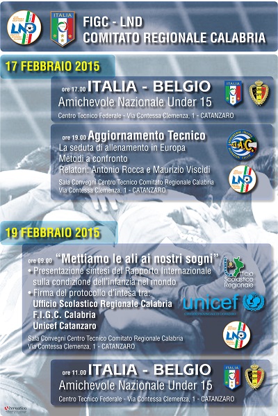Anche la seconda amichevole Under 15 Italia – Belgio al Centro di Formazione Federale di Catanzaro ha avuto una sua degna cornice con la manifestazione “Mettiamo le ali ai nostri sogni”, che ha visto come protagonisti il mondo della scuola e quello del calcio.