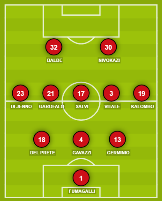 FOGGIA (3-5-2): 1 Fumagalli; 13 Germinio, 4 Gavazzi, 18 Del Prete; 19 Kalombo, 3 Vitale, 17 Salvi, 21 Garofalo, 23 Di Jenno; 30 Nivokazi, 32 Balde. A disposizione: 36 Jorio, 2 Galeotafiore, 16 Agostinone, 28 Pompa, 35 Turi, 10 Curcio, 15 Said, 20 Moreschini, 25 Morrone, 26 Iurato, 33 Rocca, 24 Dema. Allenatore: Marchionni.