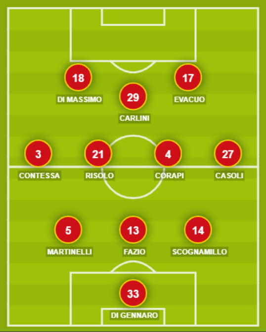CATANZARO (3-4-1-2): 33 Di Gennaro; 14 Scognamillo, 13 Fazio, 5 Martinelli; 27 Casoli, 4 Corapi, 21 Risolo, 3 Contessa; 29 Carlini; 17 Evacuo, 18 Di Massimo. A disposizione: 22 Branduani, 19 Gatti, 20 Riccardi, 32 Garufo, 8 Verna, 10 Parlati, 23 Baldassin, 34 Porcino, 7 Curiale, 9 Jefferson, 15 Molinaro, 25 Grillo. Allenatore: Calabro.